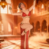 This dazzling belly dance ensemble features flowing fabrics and intricate metallic details that shimmer with every move.