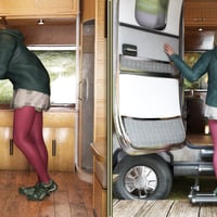 Each pose reflects those golden-hour moments when the day winds down: leaning against the van after a long drive, sitting by the fire with tired but content posture, stretching legs toward the warmth of the flames, or simply gazing at the horizon as the sun melts into the landscape.