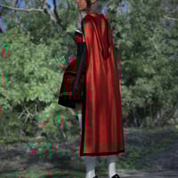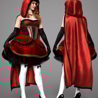 A whimsical Red Riding Hood–inspired outfit with cape, corset, and voluminous skirt—ideal for fantasy, cosplay, or seasonal scenes. Featuring a cape, dress, gloves, heels, stockings, and panties.