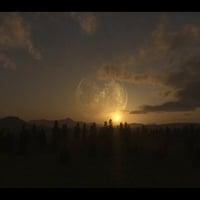 The skysphere/HDRI shows a huge moon starting a solar eclipse, stars are showing between the clouds.
