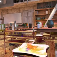 This indoor environment is an impeccably crafted artist's workroom, ready for any artist who dabbles in painting, pottery, sculpture, origami, and photography.