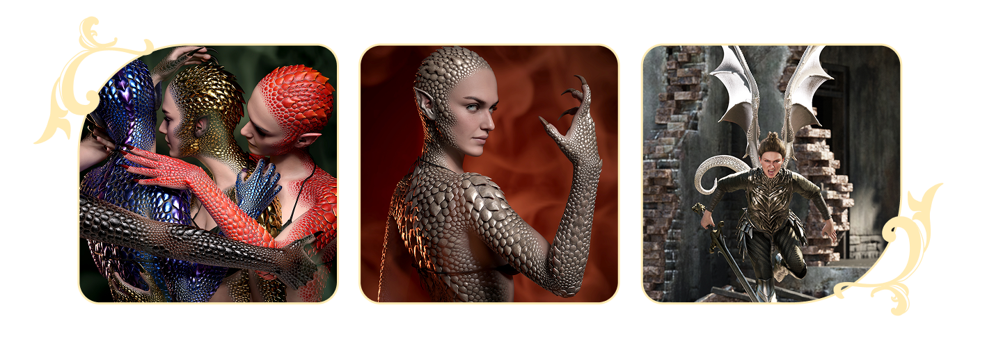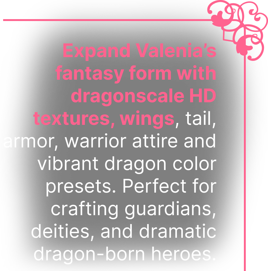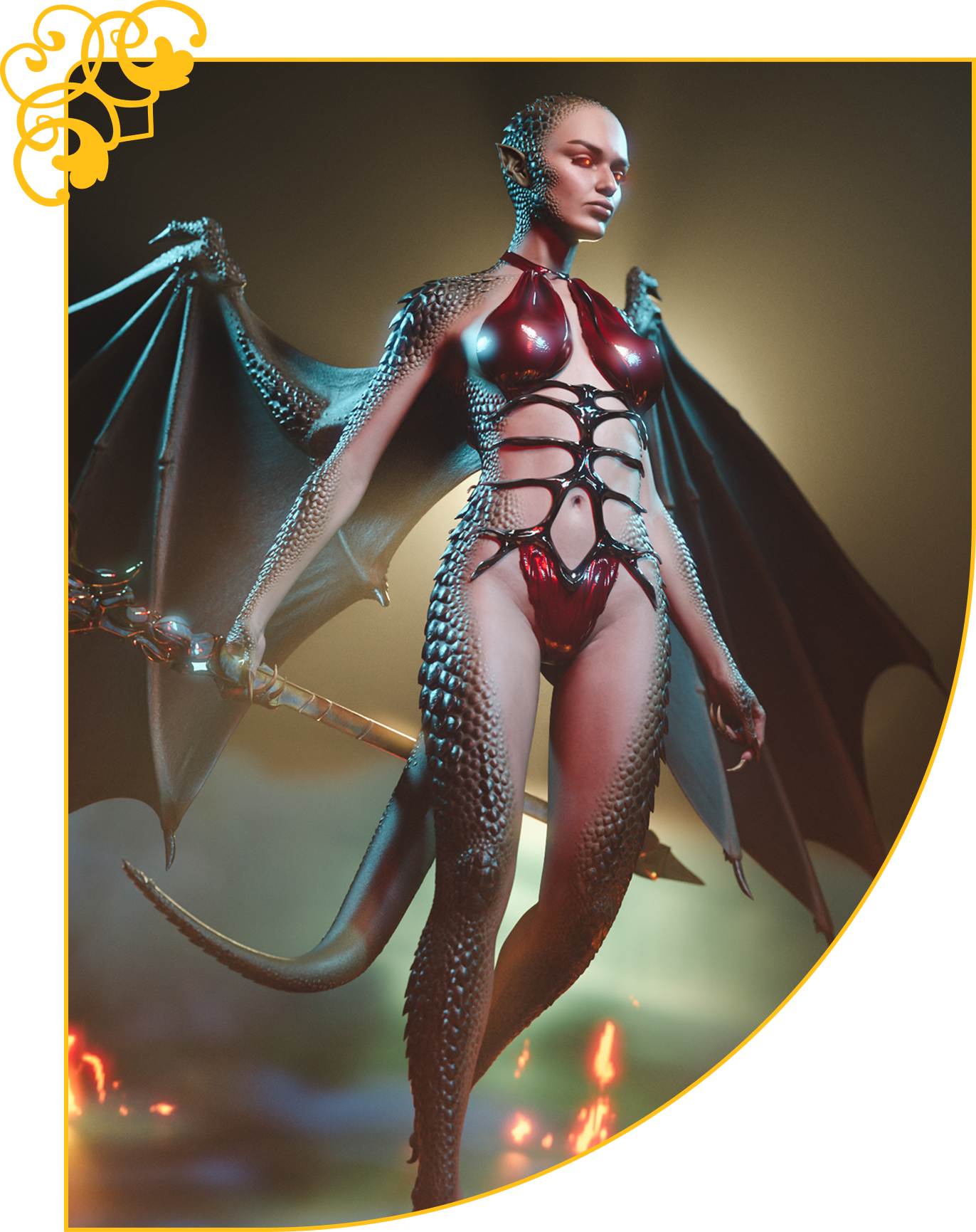 A special Valenia Persona, preloaded as a detailed dragon with eight vivid dragon color presets - from gold to green, platinum and more. Use this dragon preset to transform any Genesis 9 character!