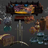The Swords, Containers, Crates, Shields, Plants and Food and Drink in this Prop pack will all fit in to make a stunning period scene.