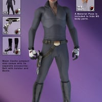 Ask me if I care.'Major Cache is a conforming clothing and prop set for Michael Version 3. The package includes 10 conforming items, two props, and Material Poses. The conforming items are armor for the chest, legs, arms, shoulder, and hip. Also included are gloves, helmet, jumpsuit, ranger coat, side pistol holster, and a pair of boots. Props include a hand gun (pistol) and rifle.