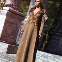 - A textured, Viking-era, khaki dress with cape, leather corset, and fur shawl