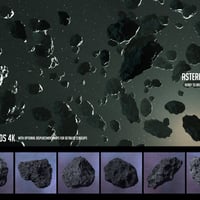 Six 4k asteroid props, and an instanced asteroid field. All asteroid props can also be used as hero props by activating the displacement subdivision in the Surfaces tab.