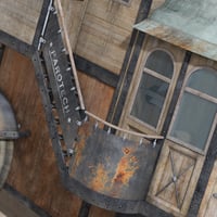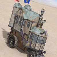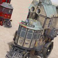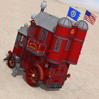Steam House is a 3D house-on-wheels, steampunk style! This two-story vehicle features an engine room on the ground floor that chugs along at a slow-but-steady pace, while the second floor has a living room and balcony from which to admire the roadside views.